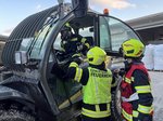 In einer Lagerhalle war geschreddertes Kunststoffmaterial in Brand geraten. Um die Löschmaßnahmen vollständig abschließen zu können, wurde das brennende Material mit einem Radlader aus der Halle gebracht und anschließend im Freien nachgelöscht.