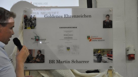 Ein besonderer Höhepunkt des Abends war die feierliche Verleihung des Goldenen Ehrenzeichens der Gemeinde Maria Neustift an Martin Scharrer – als Anerkennung für seine außergewöhnlichen Verdienste um das Feuerwehrwesen und die Gemeinde.