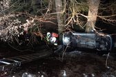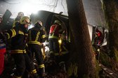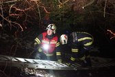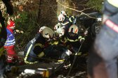 Nach dem Eintreffen von Rotem Kreuz und Feuerwehr sicherten die Florianis den Zugang über die rutschige Böschung mit Leitern. Das Unfallfahrzeug stabilisierten sie mit Stab-Fast und der Fahrzeugseilwinde des Löschfahrzeugs.