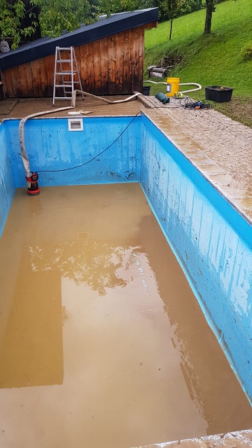 MARIA NEUSTIFT, 17.09.2020. Die Freiwillige Feuerwehr Hofberg wurde um 6:30 Uhr zu unwetterbedingten Verklausungen in Hofberg alarmiert. Die Verklausung führte zu Verunreinigungen bei einem Pool, einem Pool Haus und einer Bienenhütte, die von den Einsatzkräften beseitigt wurden und sich auch auf die nahegelegene Straße erstreckten.