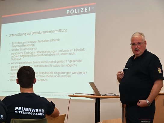 Gastreferent und Brandursachenermittler der Polizei, E-ABI Walter Heubusch, trug einen sehr interessanten und praxisnahen Vortrag seines Sachbereiches vor. Insbesondere referierte er mit praxisnahen Beispielen und Bildmaterial, welche bei den Ermittlungen immer wieder zu Erfolgen führten. Heubusch betonte unter anderen, dass die Zusammenarbeit zwischen Polizei und den Feuerwehren von großer Wichtigkeit sei. In den meisten Fällen sind die Feuerwehren die ersten am Einsatzort bzw. Tatort und finden vieles vor, was für die Brandursachenermittlung wichtig sei.